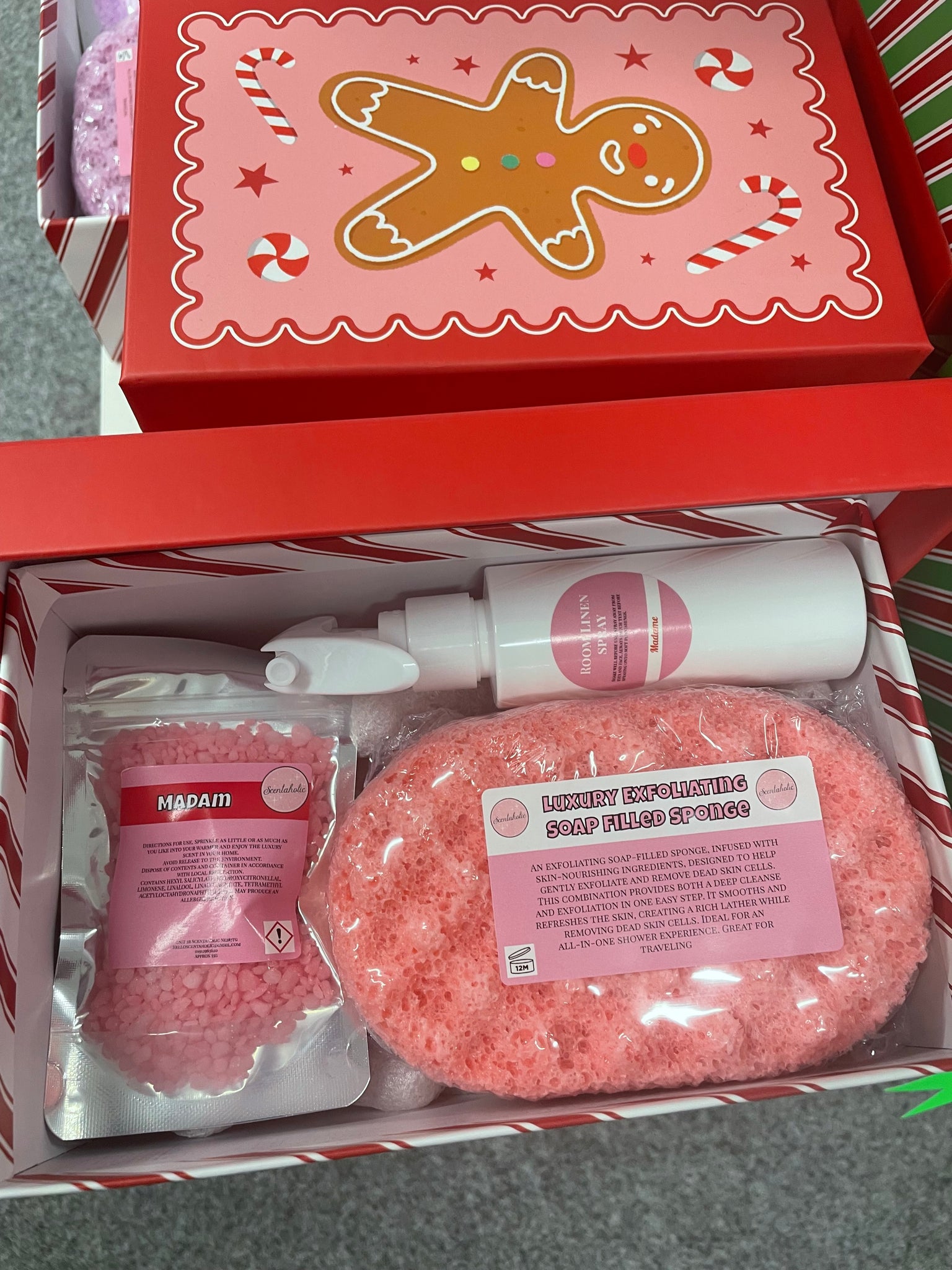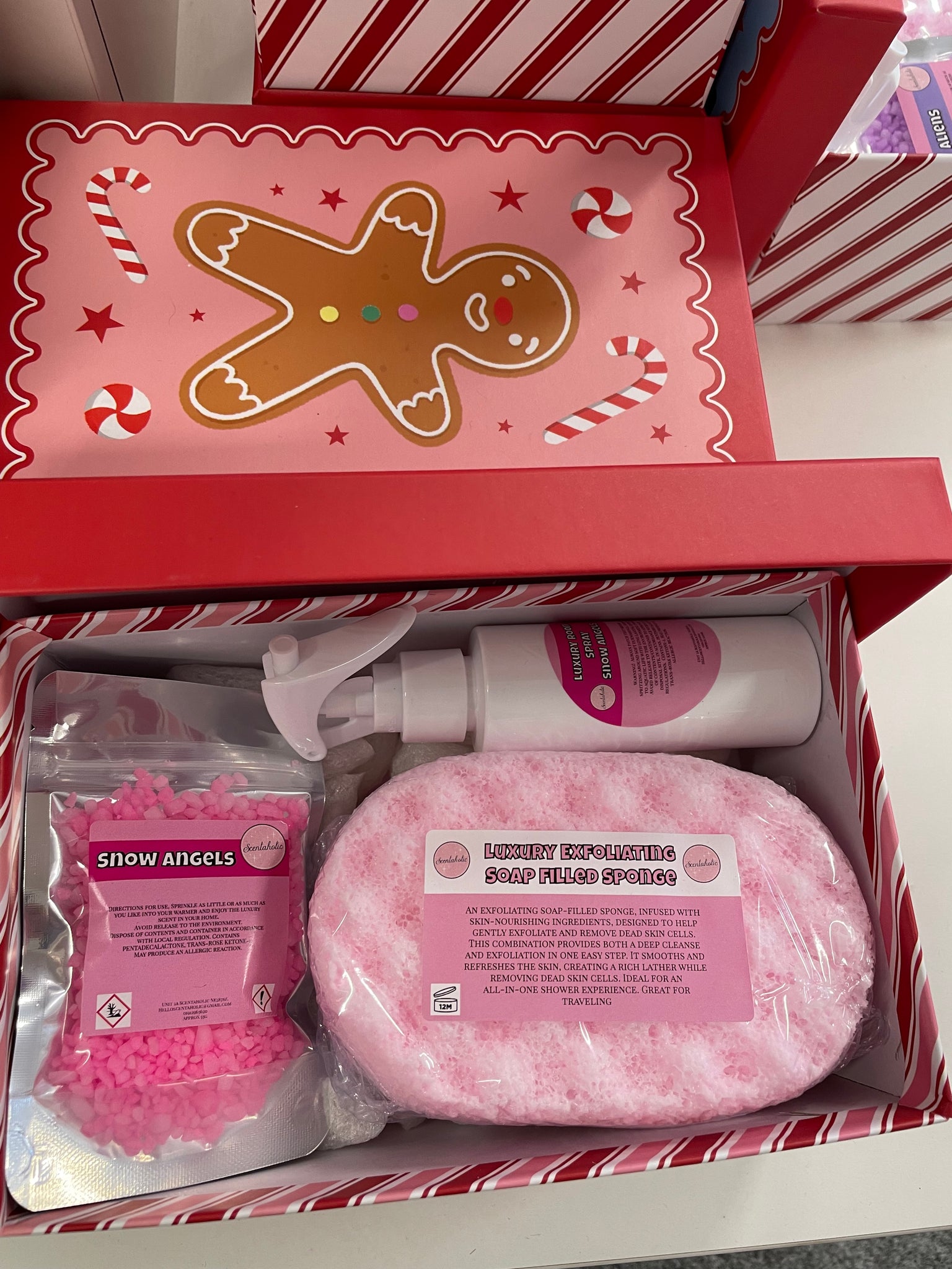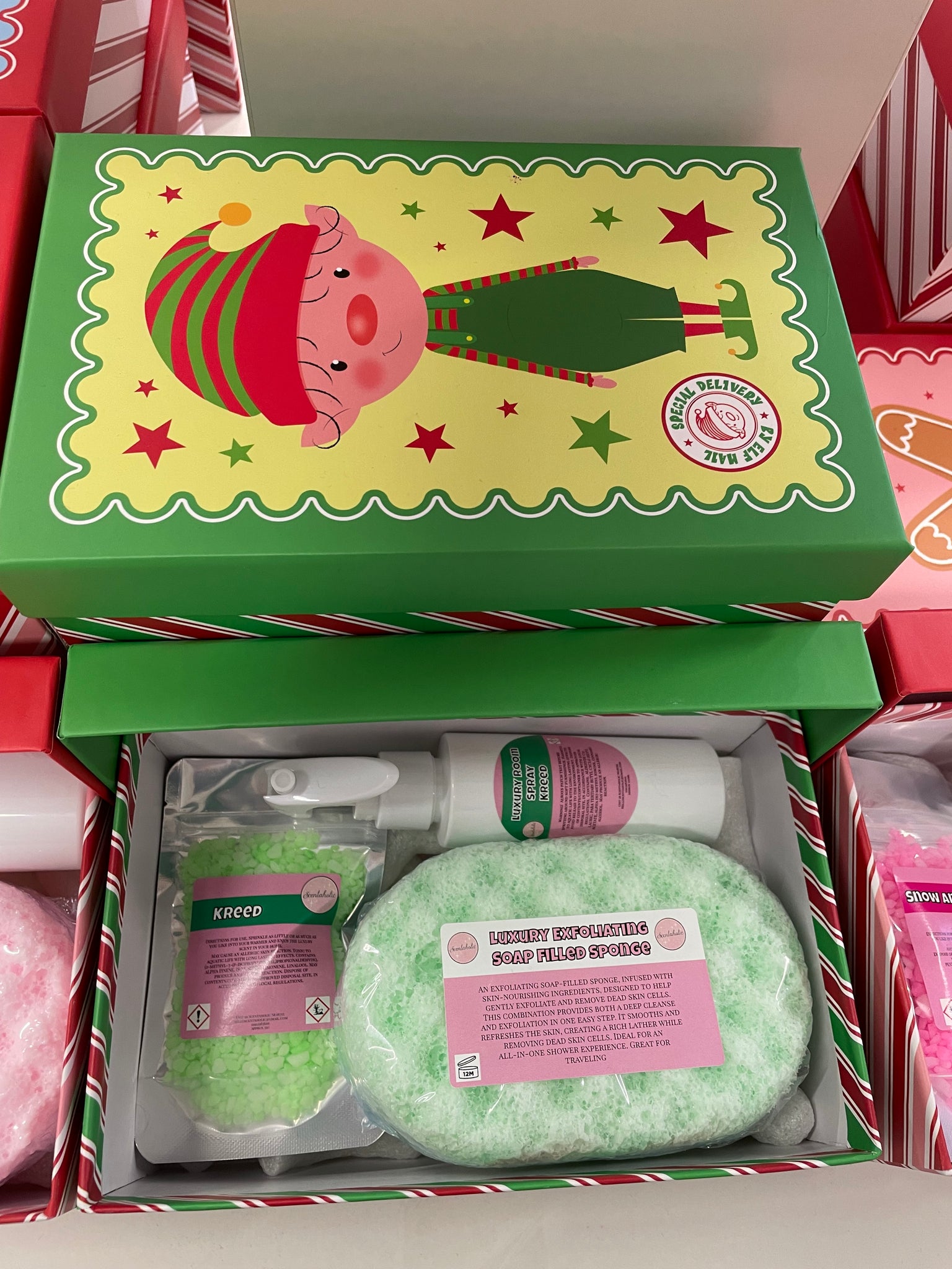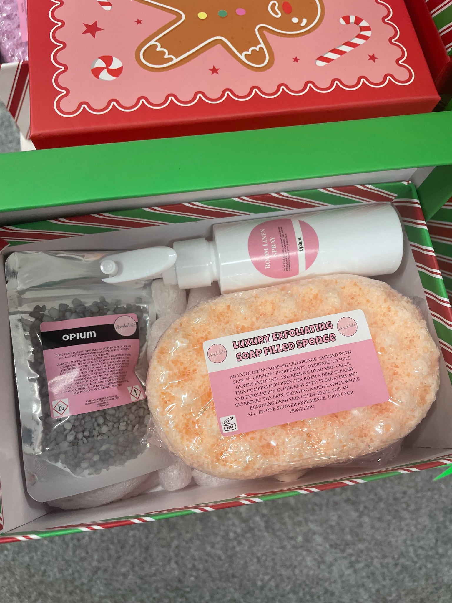 Each box set contains an exfoliating soap sponge, room linen spray and matching sizzler in a luxury reusable christmas themed gift box.