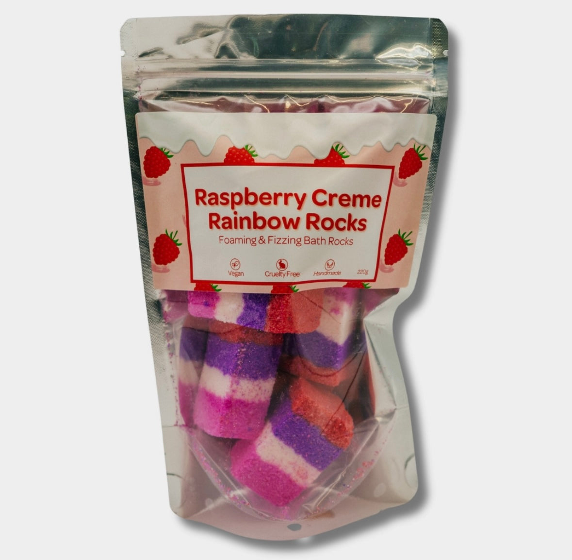 These quad-colour bath bomb rocks are a show stopper! luscious and silky Raspberry Creme is crafted to be sweet and tangy, four impressive colours leave your bath a beaming velvet red ready for your endurance.